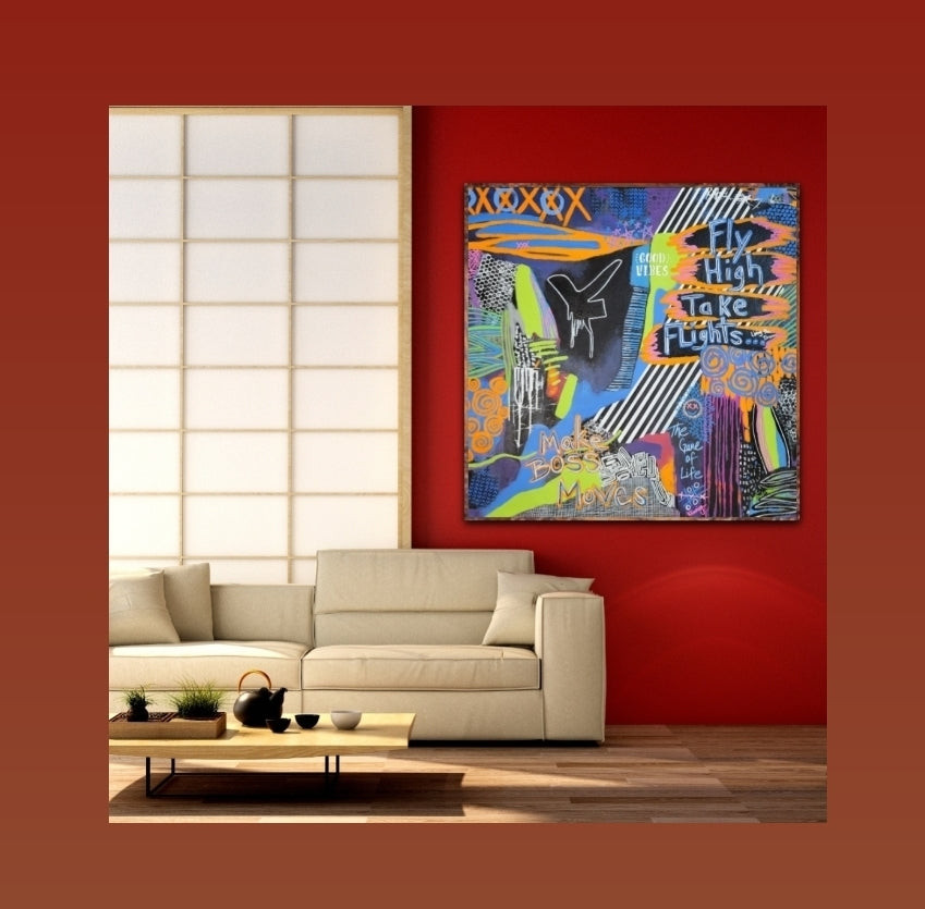 I am an abstract expressionist artist working with acrylic paint and mixed media to create bold, layered pieces that inspire action, ambition, and inner drive. My work is all about manifesting dreams and pushing beyond limits — a visual reminder to fly high and go get it.